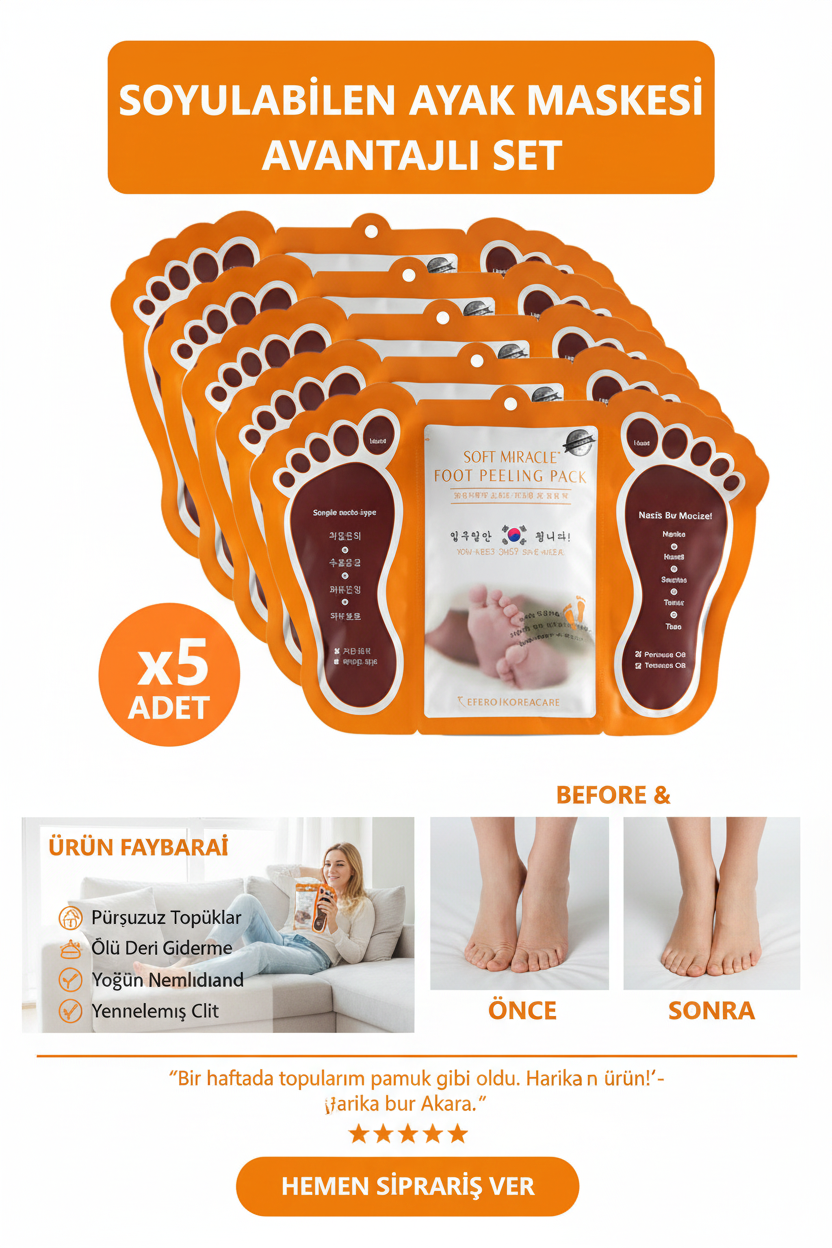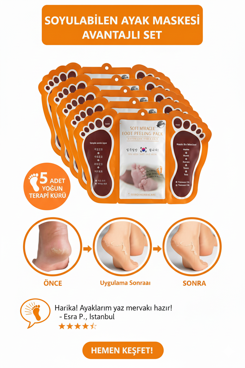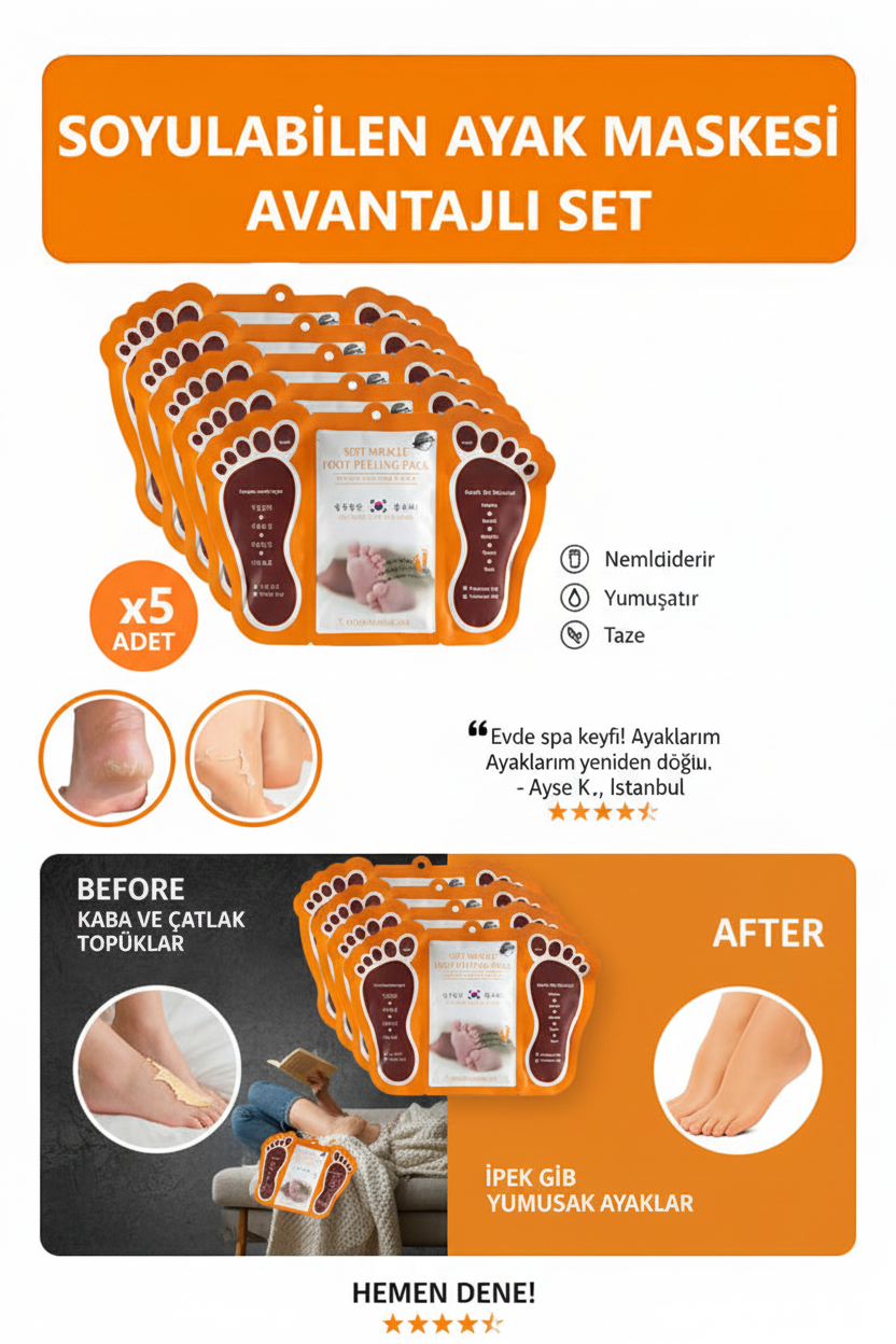 ✔️ Kullanımı çok kolay: Maskeyi temiz ve kuru ayaklarınıza giyin, 20–30 dakika bekleyin, ardından çıkarın. Soyulma etkisi 3–7 gün içinde kendiliğinden başlar.
